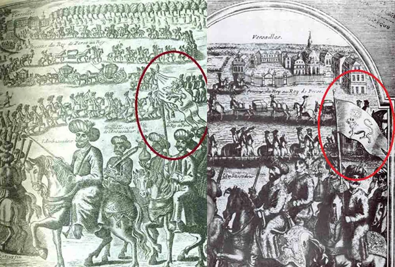 کتابی تحت عنوان فرستاده ایران به دربار لوئی چهاردهم توسط موریس هربرت (M. Herbert) در سال ۱۹۰۷ م تهیه و چاپ شده است. این کتاب شرح سفر سفیر شاه سلطان حسین صفوی (۱۱۰۵) - ۱۱۳۵ هـ.ق) و فرمانروای ایروان به فرانسه و دربار لوئی چهاردهم است. در این کتاب چند تصویر از سفیر حکومت صفوی در حال عبور از خیابانها و کوچههای پاریس موجود است. در این تصاویر پشت سر محمدرضا بیک علمدار باشی درفشی سه گوش با پیکره شیری ایستاده به چشم میخورد که خورشیدی بر بالای آن نقش شده است. این تصاویر که در زمان سفر محمدرضا بیک به تصویر درآمده اند کارکرد سیاسی و رسمی بودن درفش شیر و خورشید در دوره ی صفوی را تأیید می نماید (شاطری، ۱۳۹۵: ص ۱۶۶).