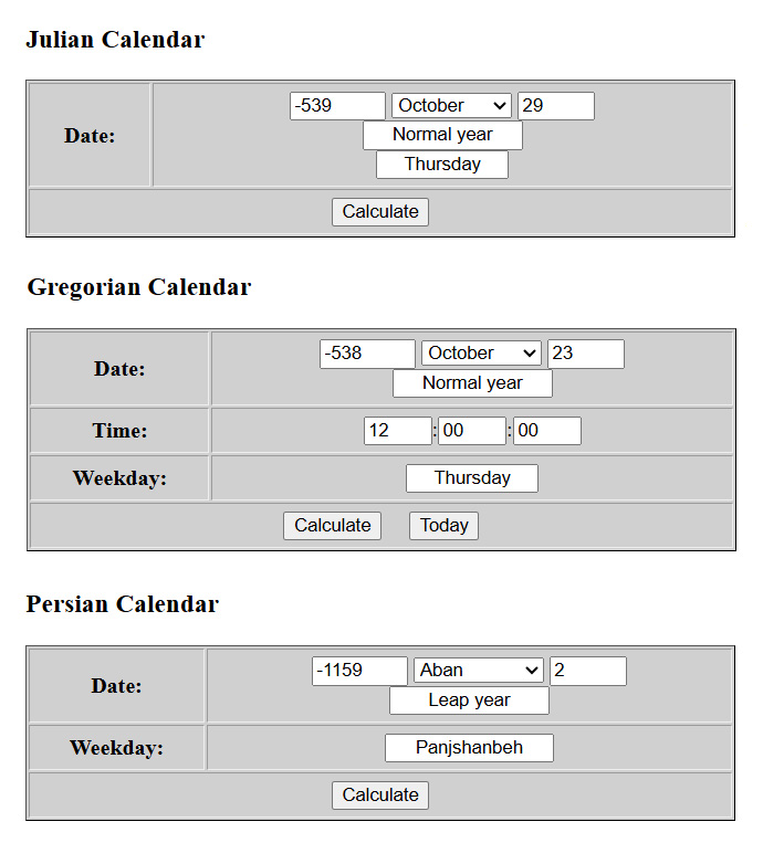 وب سایت زیر گاهشماری بابلی را به گاهشماری ژولیانی تبدیل می کند و همانطور که در تصویر زیر میبینید روز سوم ماه ارخسمنوی سال هفدهم پادشاهی نبونئید که کوروش وارد بابل شد، برابر با پنجشنبه، 29 اکتبر (۷ یا ۸ آبان) سال 539 پیش از میلاد است.