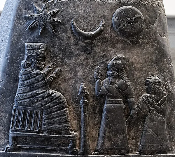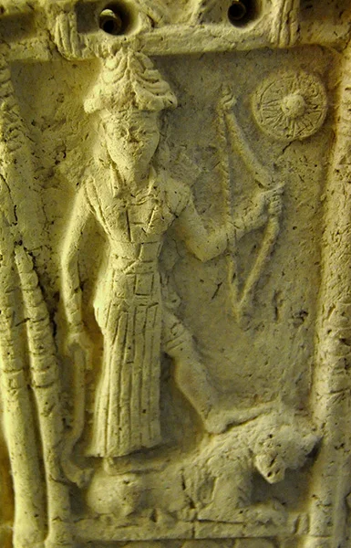 ایشتار ایستاده بر شیر. دوره بابلیِ کهن، قرن نوزدهم تا هفدهم پیش از میلاد (منبع: worldhistory.org).«ستاره ایشتار» در کنار «هلال ماه سین» و «قرص خورشید شمش»